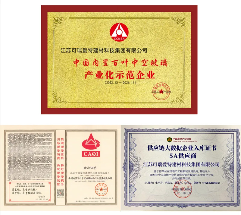 江蘇可瑞愛特建材科技集團是一家專注內置遮陽百葉中空玻璃研發(fā)、生產、銷售、服務四位一體的科技創(chuàng)新企業(yè)。技術領先,頗獲市場贊譽,先后榮獲“全國內置百葉中空玻璃行業(yè)質量領先品牌”“中國內置百葉中空玻璃產業(yè)化示范企業(yè)”“中國房地產 5A 級供應商”等稱號,是全國頂尖建材品牌、行業(yè)公認的頭部企業(yè)。